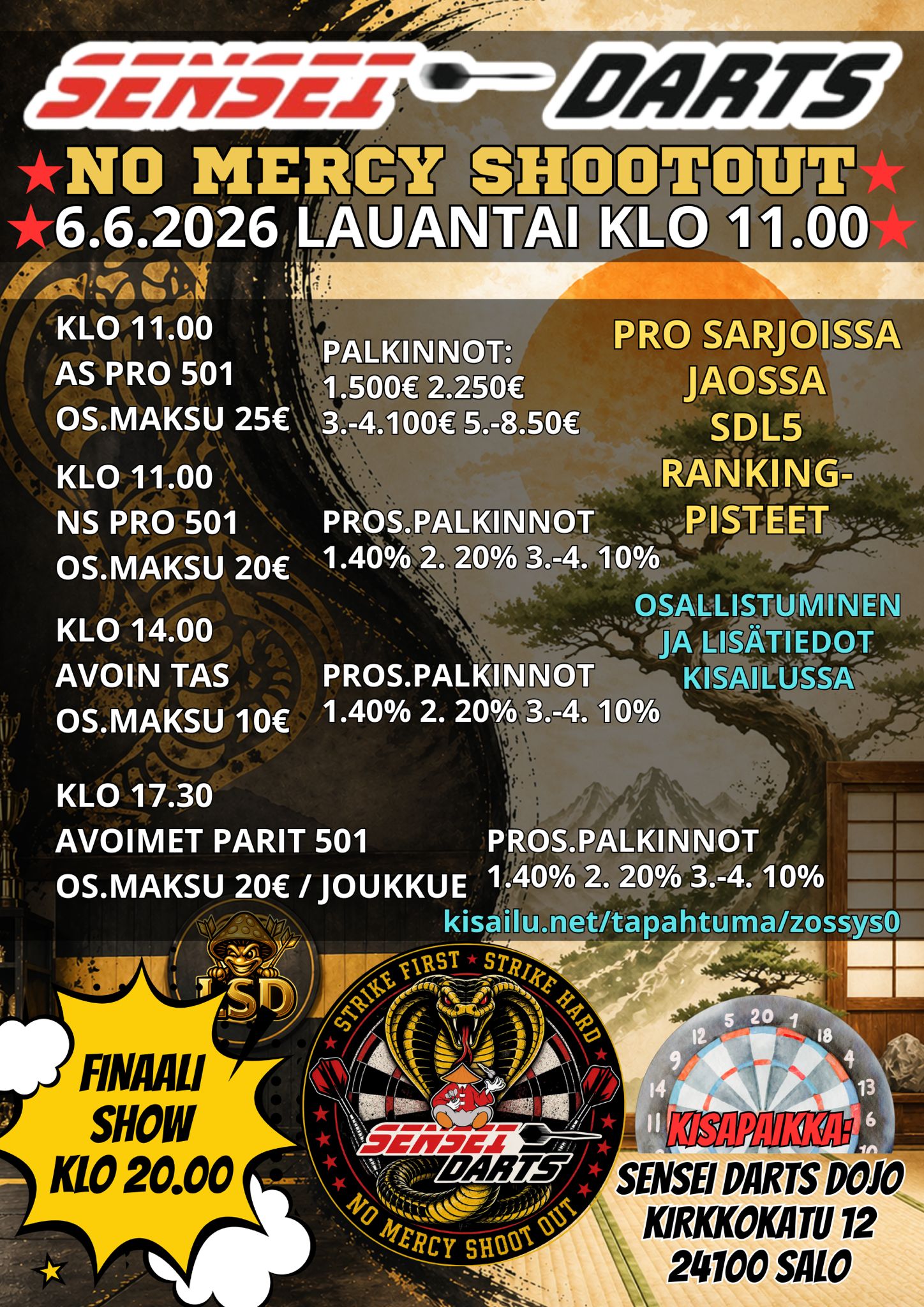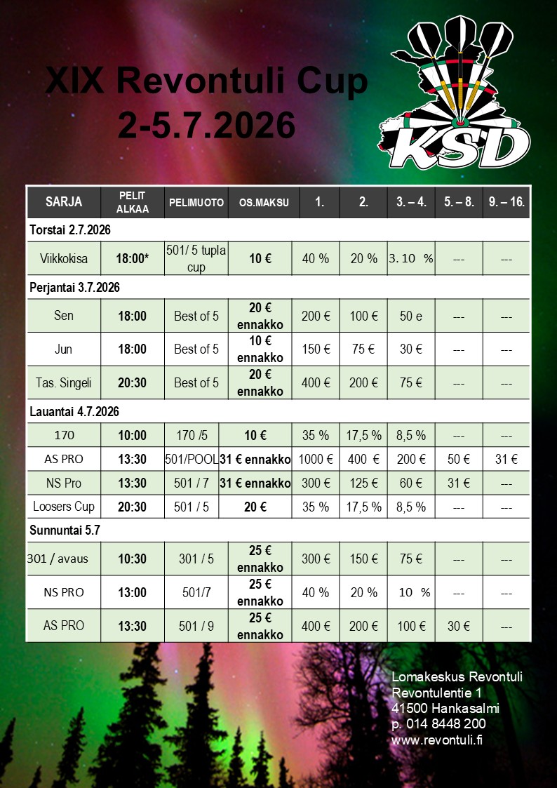 SM sarjat ennakkoilmoittautuminen ja -maksut Ilmoittautuminen päättyy 11.3.2026 klo 18:00 Kisailu.net Säännöt Kilpailuissa noudatetaan liiton yleisiä kilpailusäätöjä ja liiton kurinpitomääräyksiä. https://darts.fi/saannot/ Majoitus Huoneita voi varata nettisivujen kautta https://hotelliverso.fi tai ottamalla ... Lue lisää