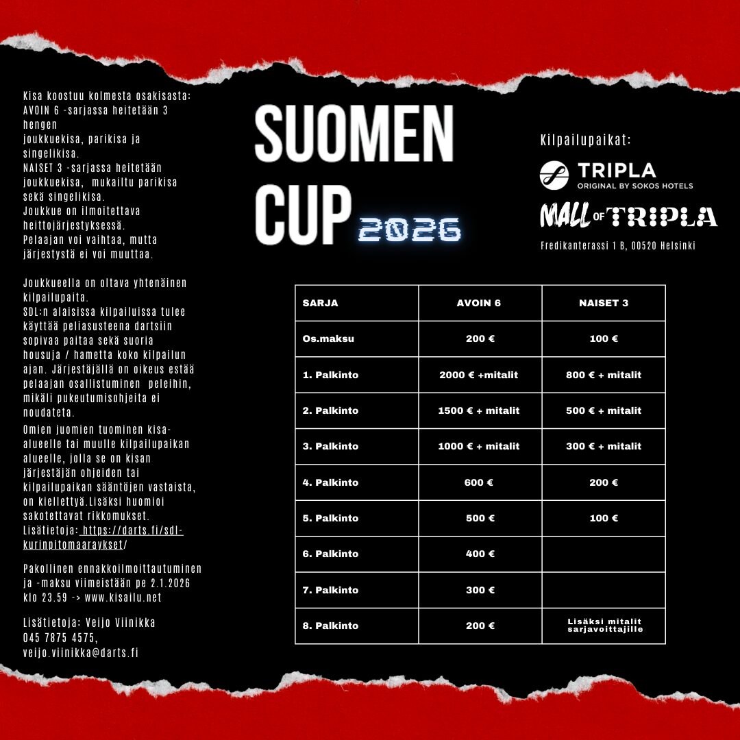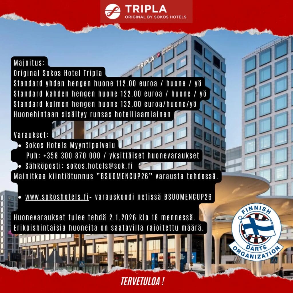 Tiedustelut liiton toimisto https://darts.fi/liiton-yhteystiedot/